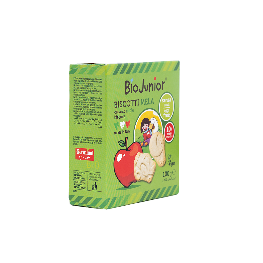 بسكويت التفاح العضوي من جيرمينال مُصمم خصيصًا للأطفال من عمر ١٠ أشهر فما فوق. مصنوع من مكونات عضوية مثل دقيق القمح، وعصير التفاح المُركز، وزيت بذور دوار الشمس، ليُقدم وجبة خفيفة صحية خالية من الإضافات والمواد الحافظة الاصطناعية.