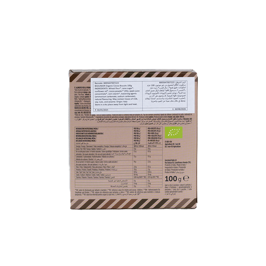 بسكويت جيرمينال العضوي بالكاكاو مُصمم للأطفال من عمر ١٠ أشهر فما فوق. مصنوع من مكونات عضوية عالية الجودة، يُقدم هذا البسكويت، الذي يزن ١٠٠ غرام، وجبة خفيفة لذيذة ومغذية بدون إضافات صناعية. مثالي للأطفال الصغار الذين يتعلمون المضغ.