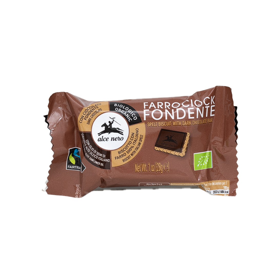 بسكويت ألسي نيرو العضوي المصنوع من دقيق القمح الكامل مع الشوكولاتة الداكنة. قطعتان من بسكويت القمح الكامل المقرمش العضوي، وزن كل منهما 14 غرامًا، مغلفتان بطبقة من الشوكولاتة الداكنة. مكونات مثل دقيق القمح الكامل وسكر القصب وزيت الزيتون البكر الممتاز تُضفي على هذه البسكويتات مذاقًا مميزًا. بحجمها الصغير، تُعدّ بسكويتات فاروتشيوك فوندينتي العضوية مثالية للسفر.