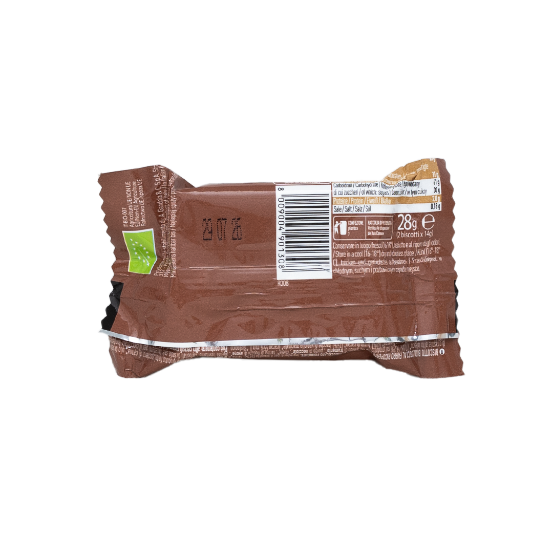 البسكويت: دقيق الشعير (60%)، سكر قصب، زيت زيتون بكر ممتاز، دقيق شوفان، عسل، هريس البندق، شراب جلوكوز الذرة، عامل تخمير (كربونات الأمونيوم، بيكربونات الصوديوم)، ملح. الشوكولاتة الداكنة (43%): سكر قصب، كتلة كاكاو، زبدة كاكاو، قرون فانيليا مطحونة. من مزارع عضوية معتمدة. نسبة الكاكاو لا تقل عن 55% من الشوكولاتة الداكنة.