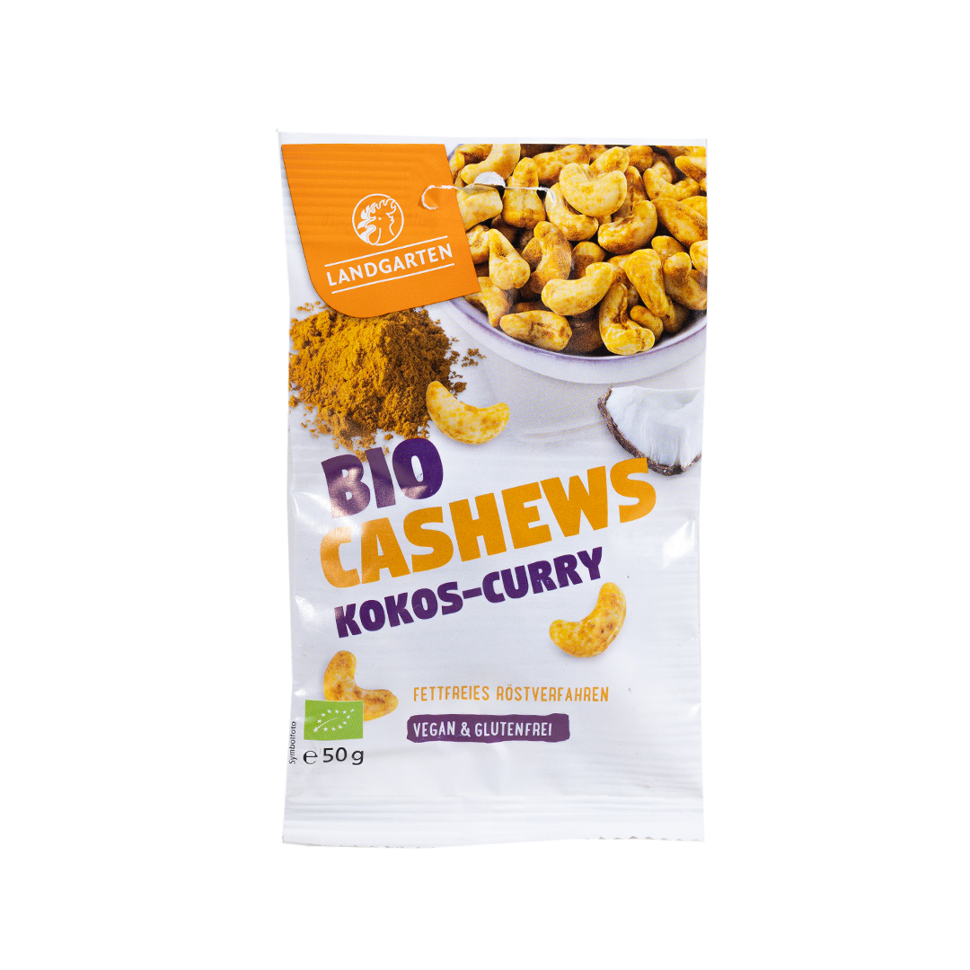 الكاجو الفاخر المغطى بالكاري الهندي العطري وجوز الهند، محمص بدون إضافة زيت للحصول على وجبة خفيفة مقرمشة وغريبة.