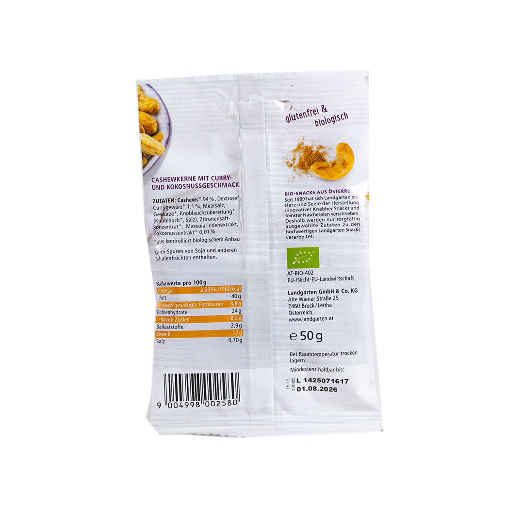 كاجو* ٩٤٪، دكستروز*، كاري* ١٫١٪، ملح البحر، جوز الهند*. *عضوي. قد يحتوي على آثار من الصويا ومكسرات أخرى.