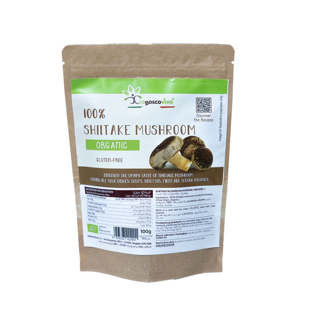 مسحوق فطر شيتاكي العضوي من IOBOSCOVIVO 100 جرام هو غذاء فائق الجودة مطحون جيدًا مصنوع من 100% من فطر شيتاكي المزروع في أوروبا (Lentinula edodes)، المزروع على خشب البلوط لتحسين النقاء ومحتوى فيتامين د - حتى 300 مرة أكثر من شيتاكي التقليدي .