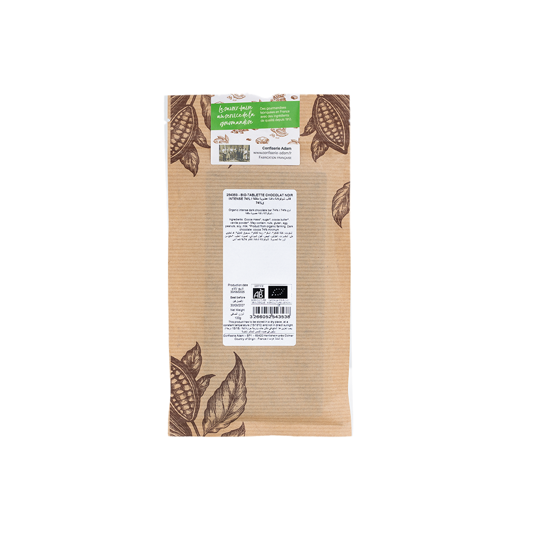 لوح شوكولاتة داكنة عضوية مكثفة 74% 100 جرام