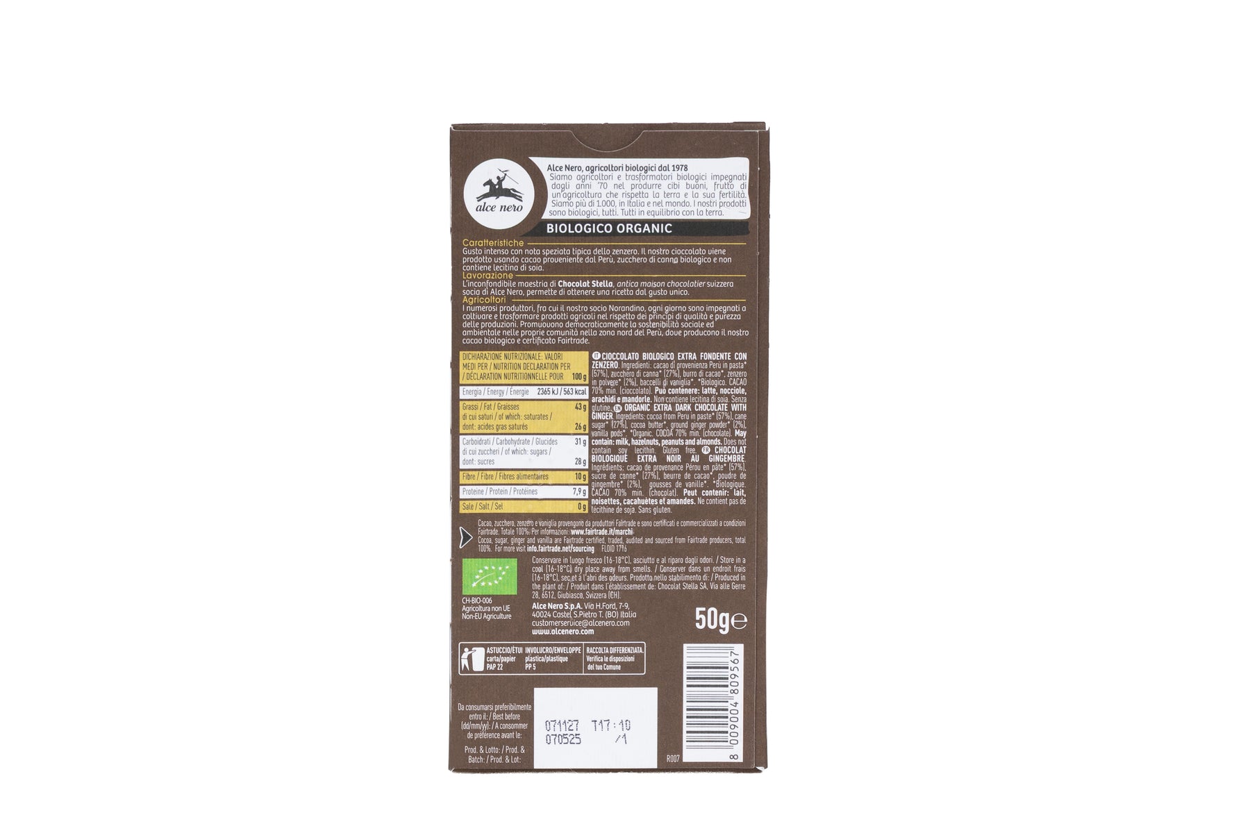 المكونات: معجون الكاكاو من البيرو (57%)، قصب السكر (28%)، مسحوق الزنجبيل بزبدة الكاكاو (2%)، قرون الفانيليا. عضوي. الحد الأدنى 70% كاكاو (شوكولاتة).