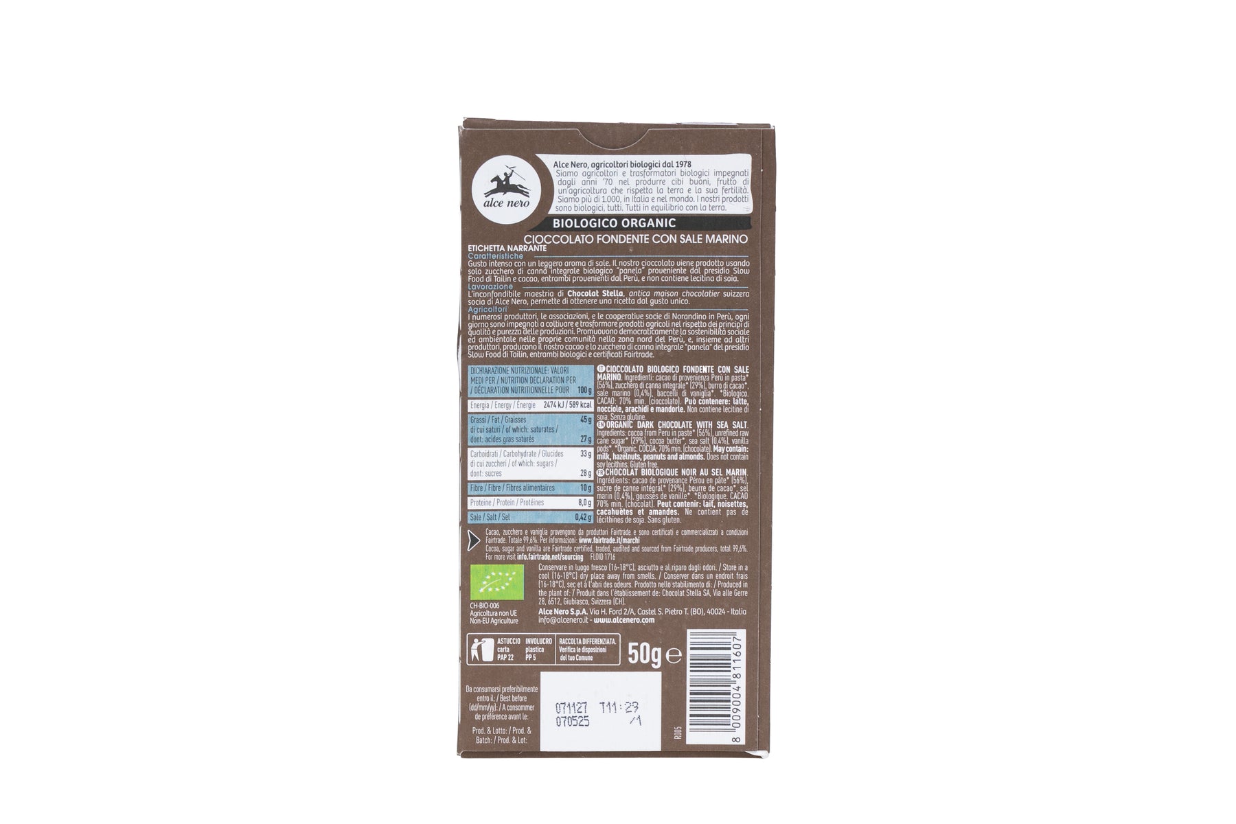 تحتوي وصفة الشوكولاتة الداكنة Alce Nero بنسبة 70% مع ملح البحر على كاكاو بيرو أحادي المصدر مع القليل من ملح البحر. هذه الشوكولاتة الداكنة مع ملح البحر هي التوازن المثالي بين الحلو والمالح. علاوة على ذلك، فإن مسحوق الكاكاو و65% من ملح البحر يمنحان هذه الشوكولاتة الكمية المناسبة من المعادن.