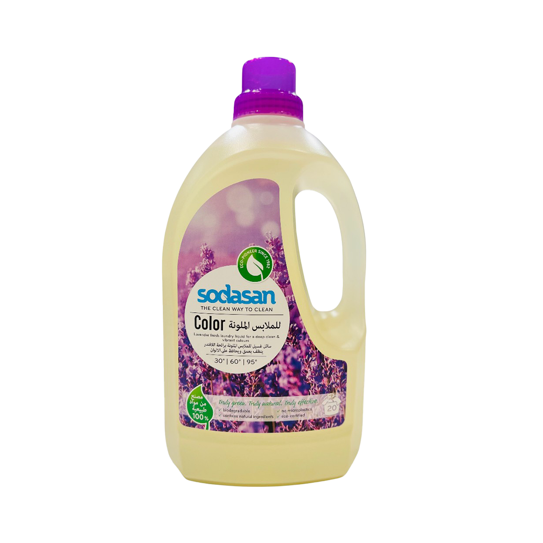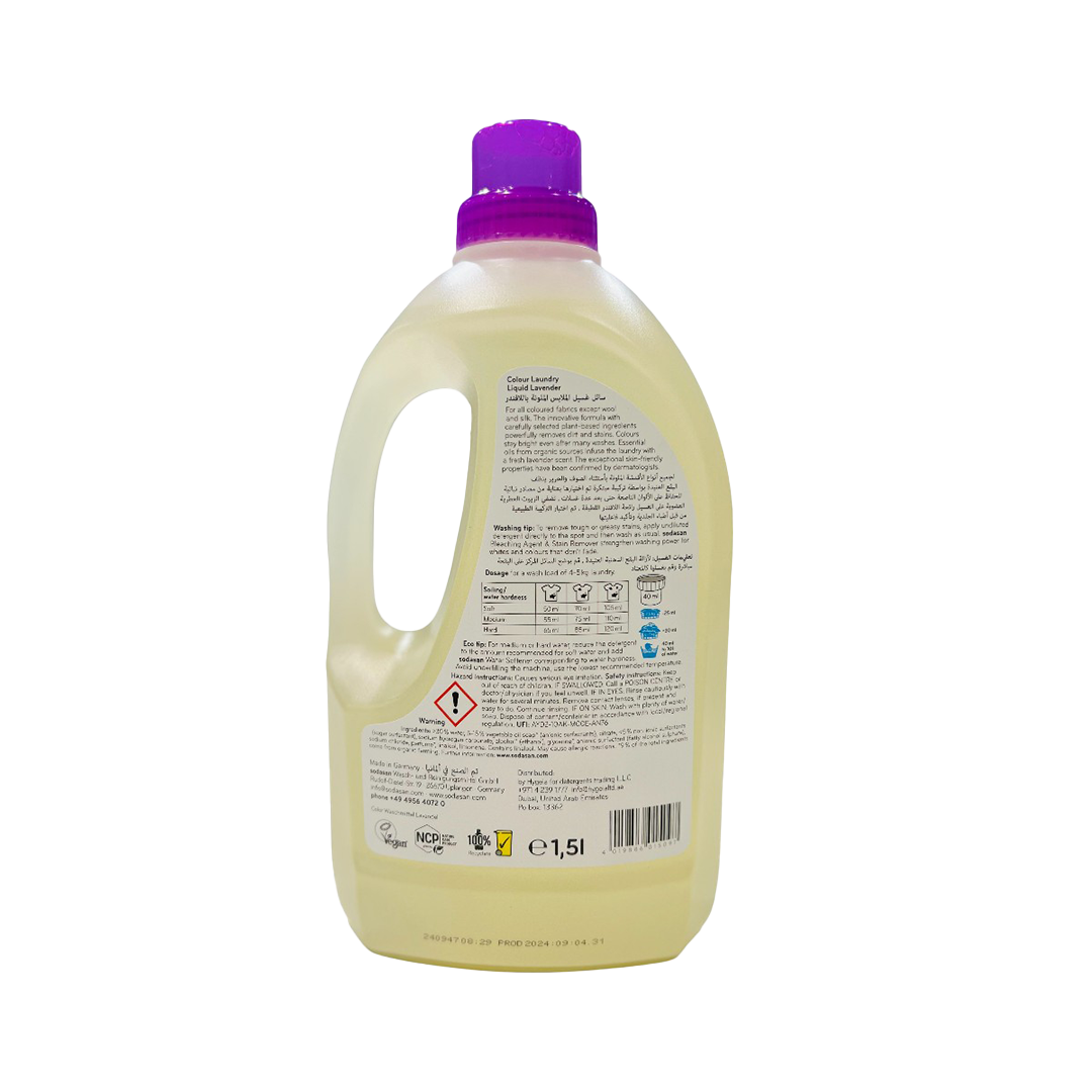 سائل غسيل الملابس العضوي الملون برائحة اللافندر من سوداسان هو منظف نباتي مصمم للأقمشة الملونة (باستثناء الصوف والحرير). يزيل الأوساخ والبقع بفعالية، ويحافظ على إشراقة الألوان حتى بعد عدة غسلات. تحتوي تركيبته على زيوت عطرية لرائحة اللافندر الطبيعية، وقد تم اختباره من قبل أطباء الجلدية للتأكد من توافقه مع البشرة.