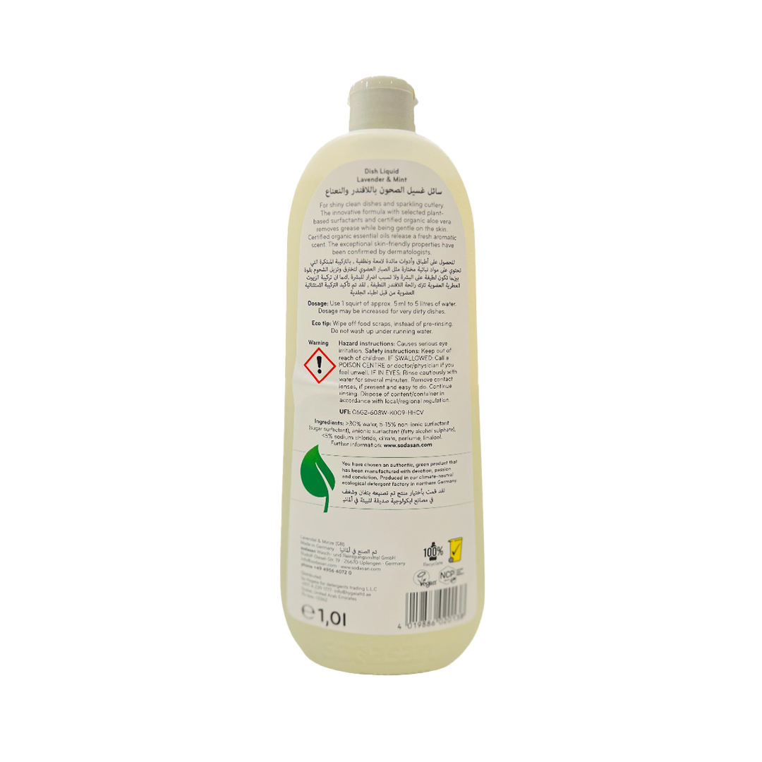 سوداسان سائل غسيل أطباق عضوي برائحة اللافندر والنعناع (لتر واحد) هو سائل غسيل أطباق نباتي نباتي، يُنظف الأطباق بفعالية ويُلطف البشرة. غني بزيوت اللافندر والنعناع العطرية العضوية المعتمدة، ويُضفي رائحة منعشة ومهدئة أثناء الاستخدام. تركيبته قابلة للتحلل الحيوي بالكامل وخالية من الأصباغ والمواد الحافظة والعطور الاصطناعية.
