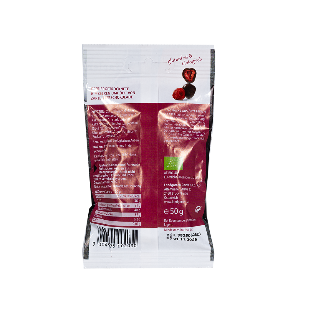 توت العليق العضوي المجفف بالتجميد بالكامل مغطى بطبقة غنية من الشوكولاتة الداكنة البلجيكية العادلة بنسبة 62%، مما يوفر نكهة حلوة حامضة نابضة بالحياة.
