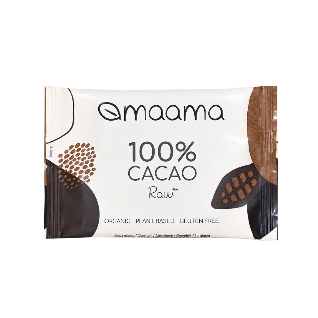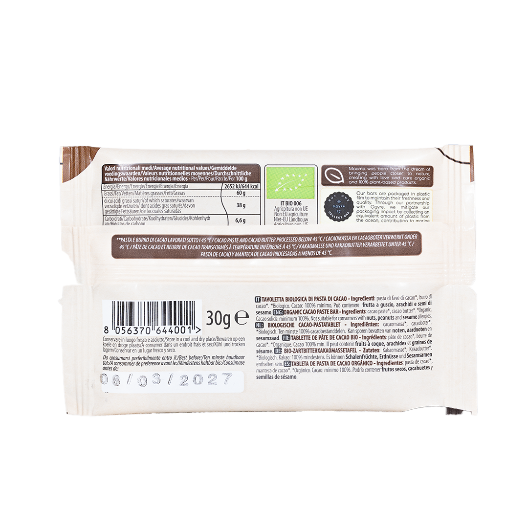 معجون حبوب الكاكاو العضوي 90%، زبدة الكاكاو العضوية 10%؛ قد يحتوي على آثار من المكسرات والفول السوداني والسمسم