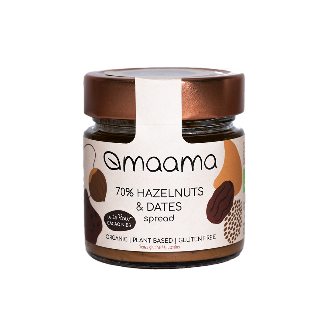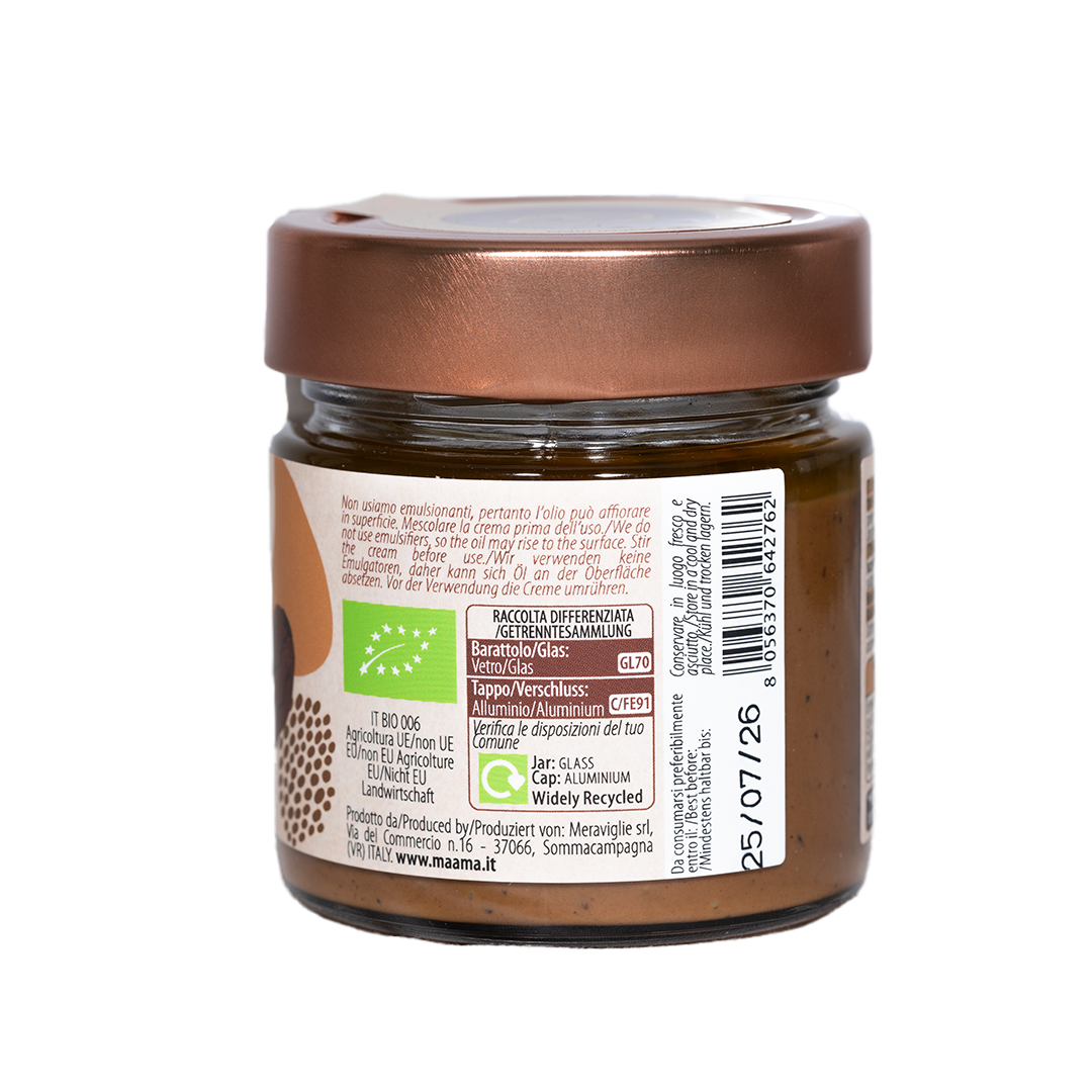 كريمة إيطالية مخملية، نباتية وخالية من الغلوتين - 70% من البندق المحمص مع مسحوق التمر وحبيبات الكاكاو الخام المقرمشة للحصول على حلاوة نقية وفاخرة.