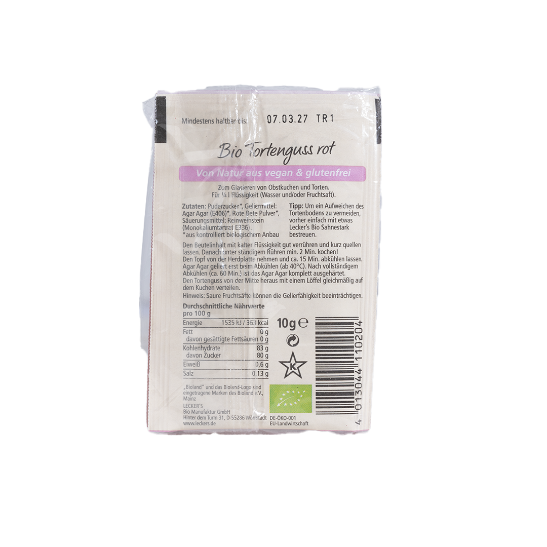 مسحوق LECKER'S Organic Cake Glazing Red 2×10 g هو مسحوق نباتي معتمد عضويًا من الاتحاد الأوروبي، يتحول إلى لمسة نهائية لامعة باللون الياقوتي لتزيين الكعك والمعجنات بالفاكهة.