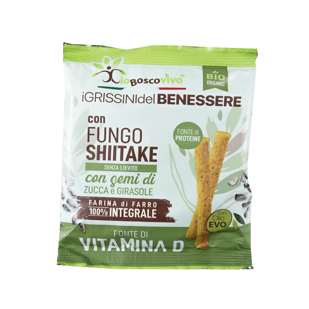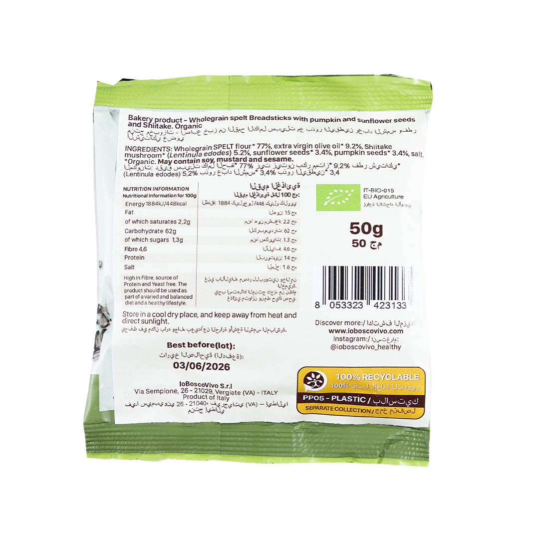 خبز جريسيني مقرمش مصنوع من 100% من دقيق القمح الكامل مع بذور عباد الشمس واليقطين والفطر الشيتاكي للحصول على نكهة لذيذة.