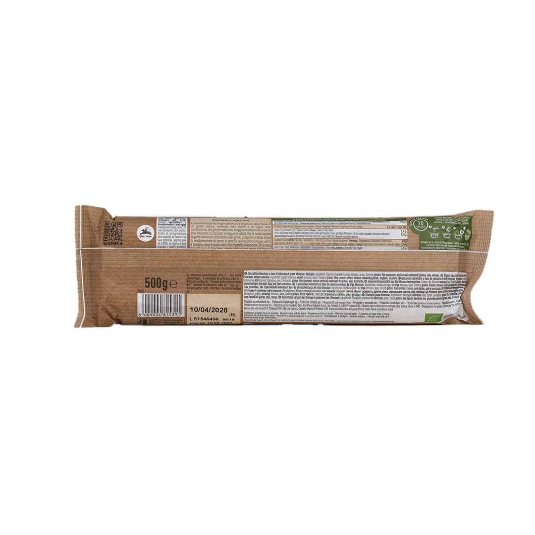 طبق مميز مصنوع من سميد قمح خراسان العضوي 100% والماء، مزروع ومطحون في إيطاليا. يتميز هذا السباغيتي المصنوع من الحبوب القديمة بنكهة جوزية قوية وقوام متماسك، مثالي لتحضير الصلصات وتحضير وجبات صحية.
