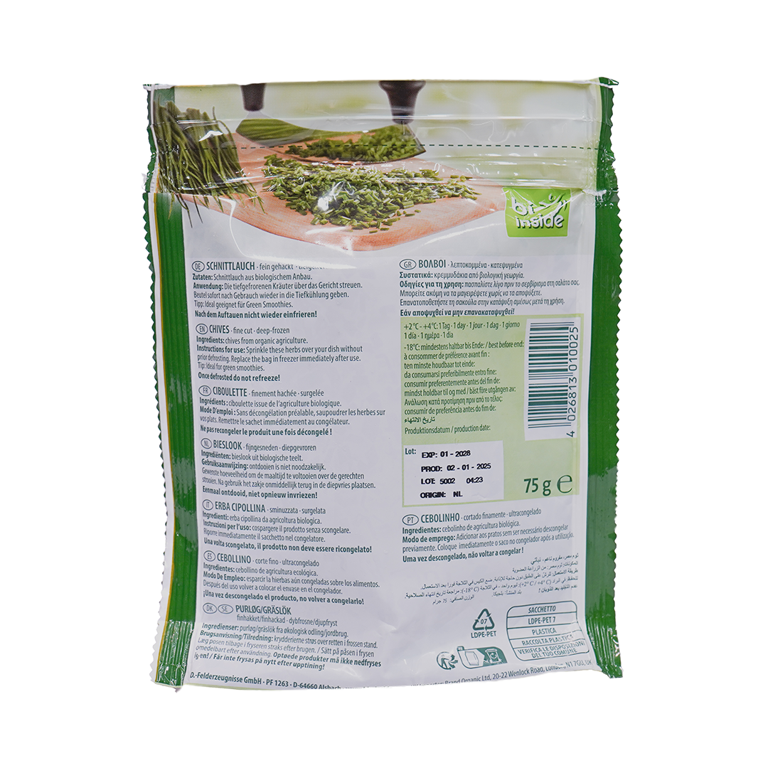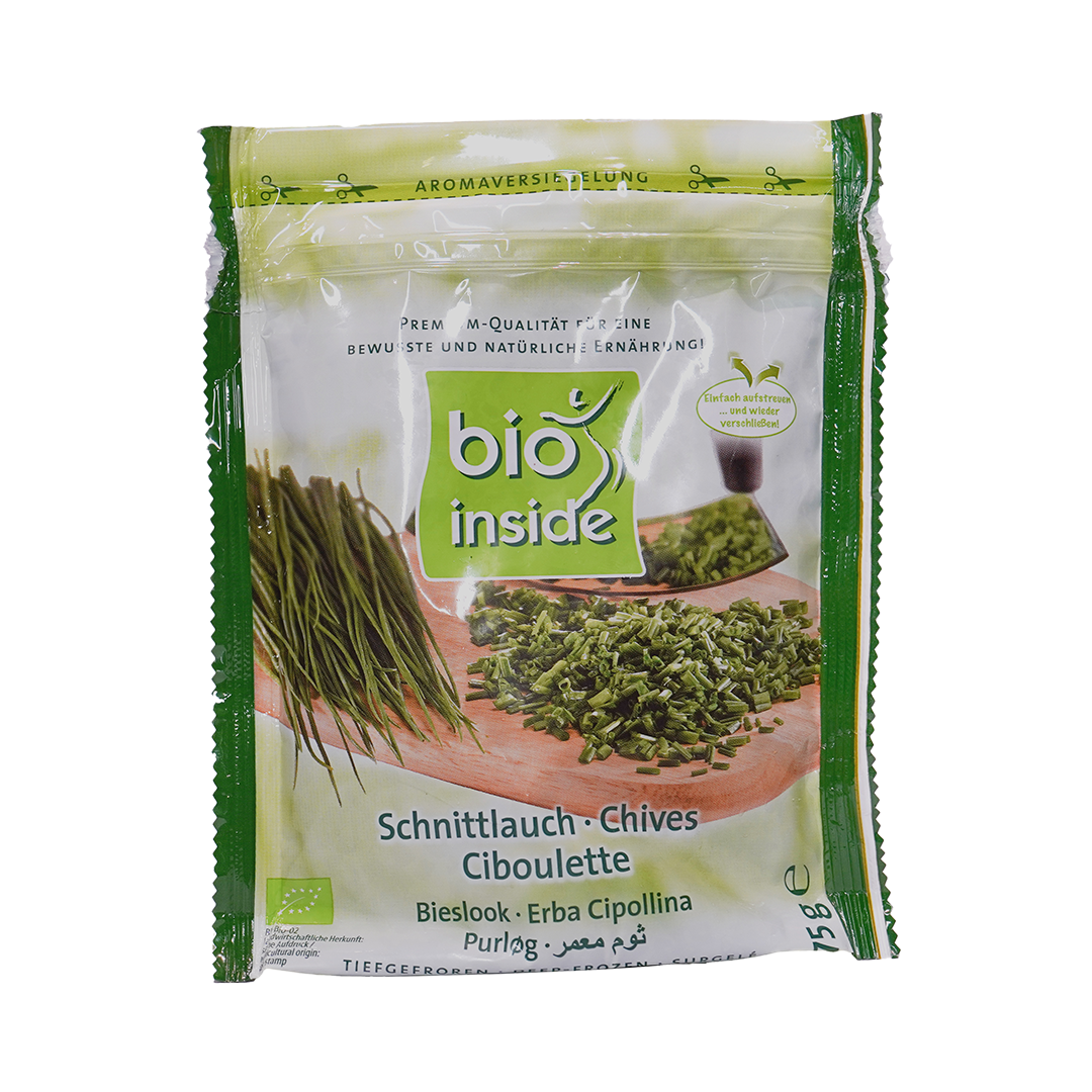 Bio Inside Organic Frozen Chives 75g are finely chopped and deep-frozen to preserve their fresh flavor and nutrients. Sourced from organic agriculture, they are ideal for garnishing soups, salads, and baked dishes, adding a subtle onion taste to your meals.