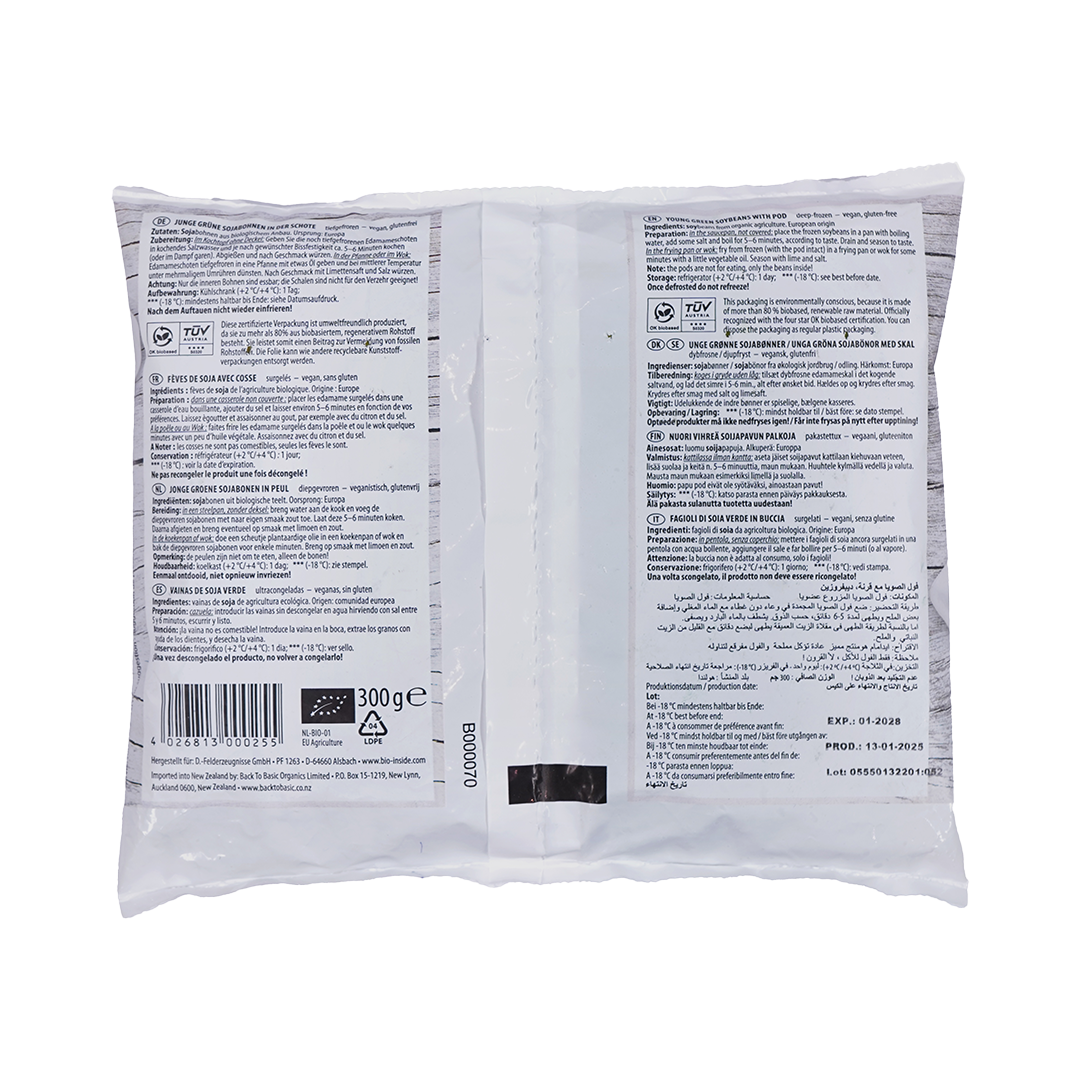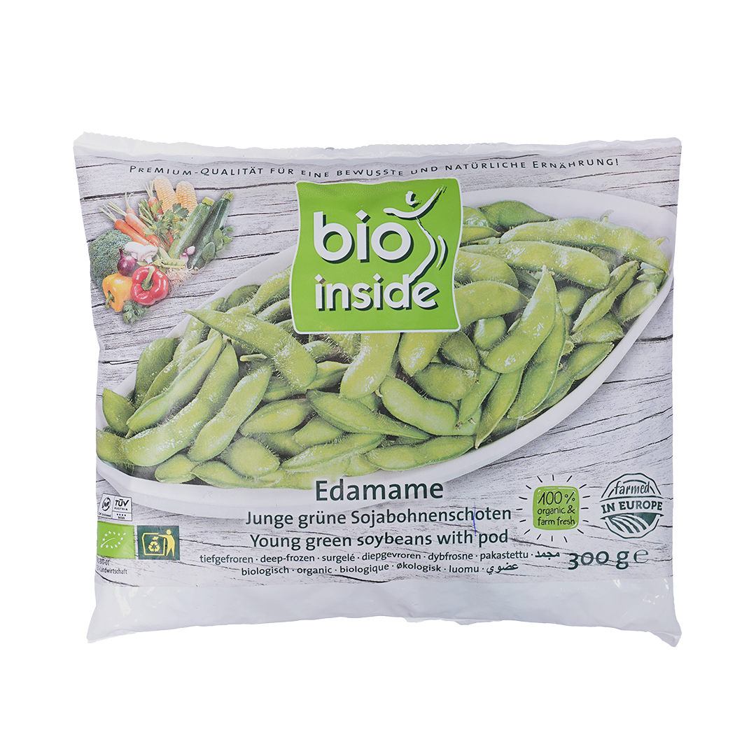 Bio Inside Organic Edamame Soy Beans are young, green soybeans harvested at their peak and immediately deep-frozen to preserve freshness and nutrients. Grown without pesticides, they offer a clean, organic snack or meal addition.