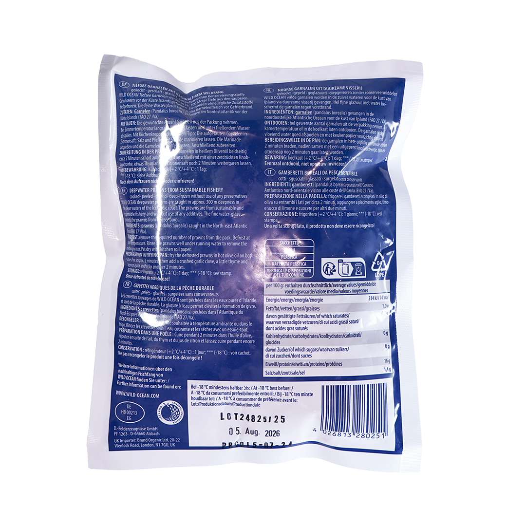 The product contains 100% wild-caught Pandalus borealis prawns, sourced from sustainable fisheries in the North-East Atlantic near Iceland. They are cooked, peeled, and glazed with water to prevent freezer burn, ensuring freshness and quality.