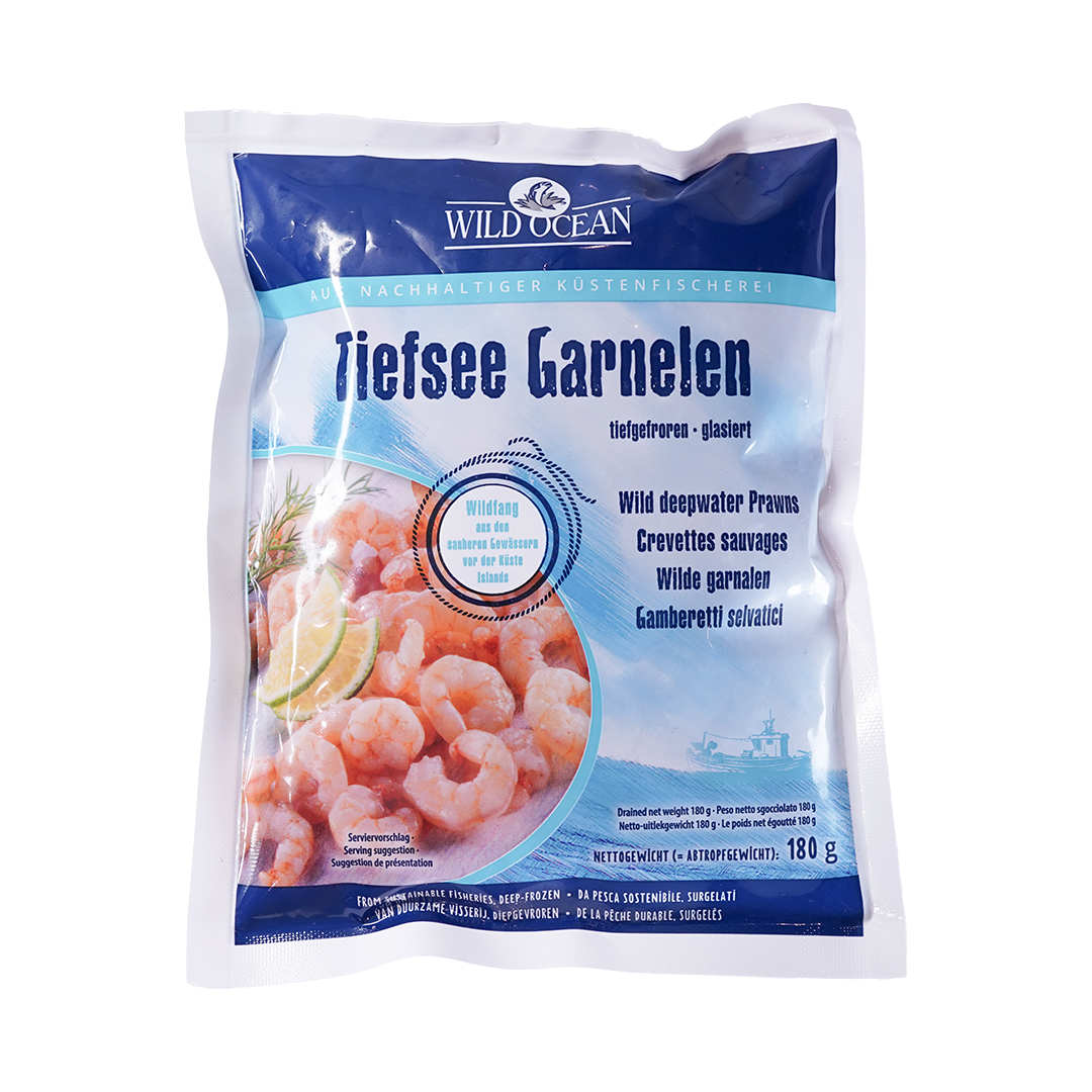 Wild Ocean Organic Ocean Wild Deep-Water Prawns are premium, sustainably sourced seafood. Harvested from the pristine waters near Iceland, these prawns are cooked, peeled, and glazed to maintain their natural sweetness and firm texture. They are ideal for various dishes, including salads, pastas, and seafood cocktails. The product is packaged in a 180g unit and is stored at -18°C to preserve freshness.