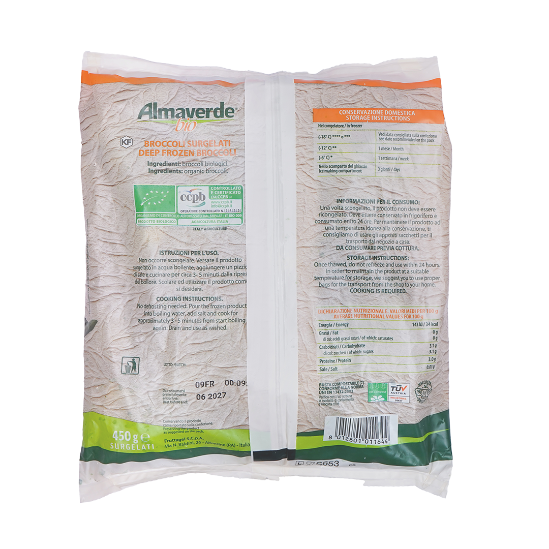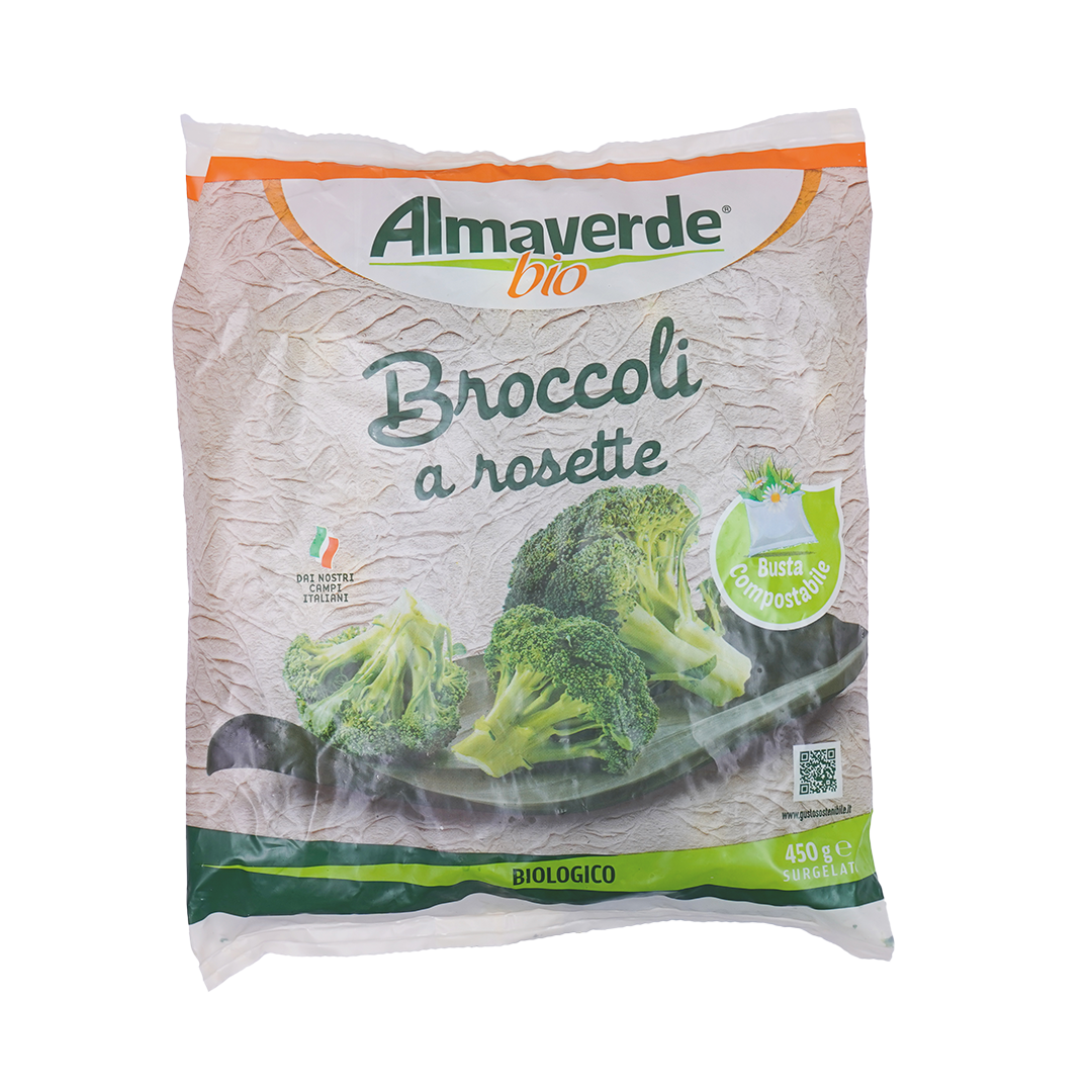 Almaverde Bio Organic Frozen Broccoli Florets 450g contains per 100g: 43 kcal, 0.6g fat, 3.1g carbs (1.9g sugars), 4.3g protein, 4.0g fiber, 0g salt, 79mg vitamin C (48% DV), 95µg folate (48% DV), and 397mg potassium (20% DV)
