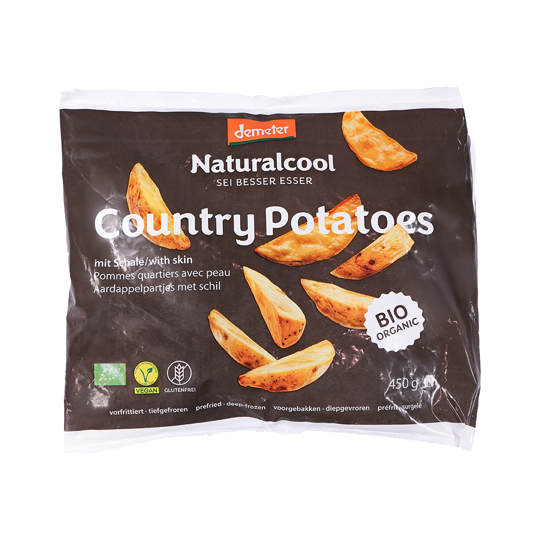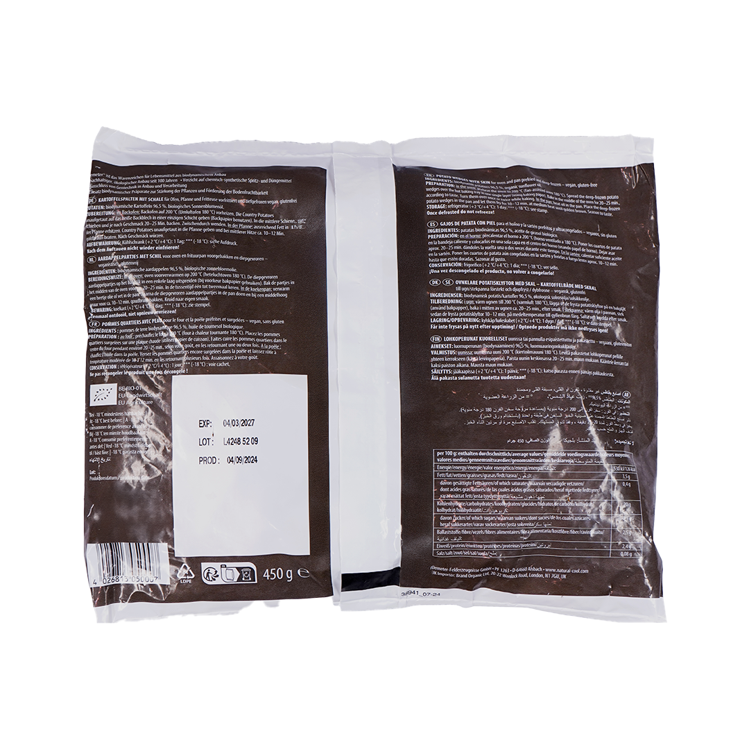 Natural Cool Organic Country Potatoes are skin-on potato wedges pre-fried in organic sunflower oil, offering a crispy exterior and soft interior. Suitable for oven or pan preparation, they are vegan, gluten-free, and Halal-certified. Packaged in a 450g bag, they are ideal for quick, nutritious meals.