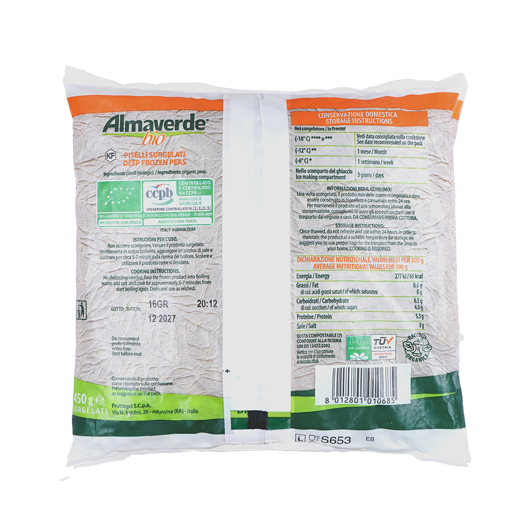 Premium Italian-grown organic extra-fine frozen peas delivered individually quick-frozen to preserve freshness, color, and flavor. Convenient and versatile for salads, soups, stews, and sides—ready to elevate your healthy meals straight from freezer to plate.