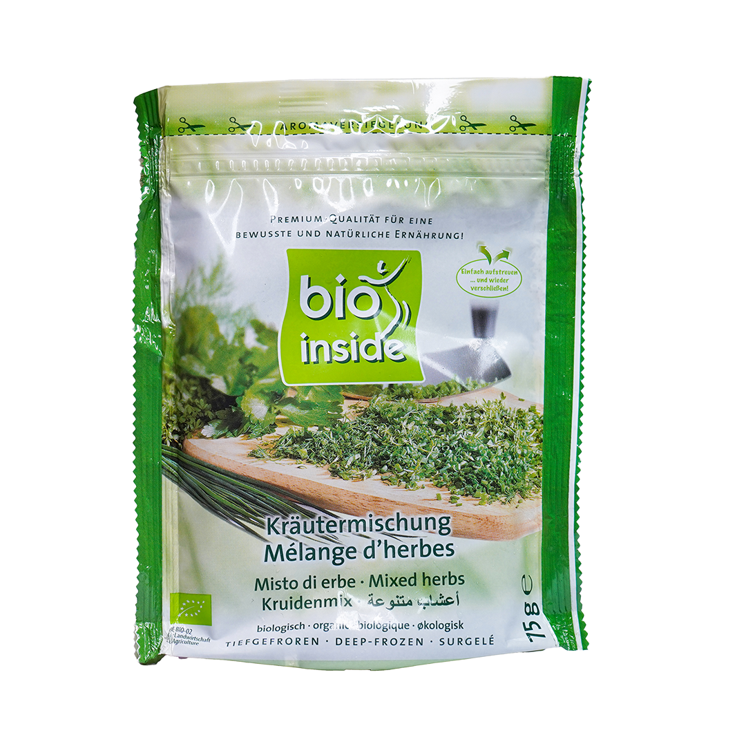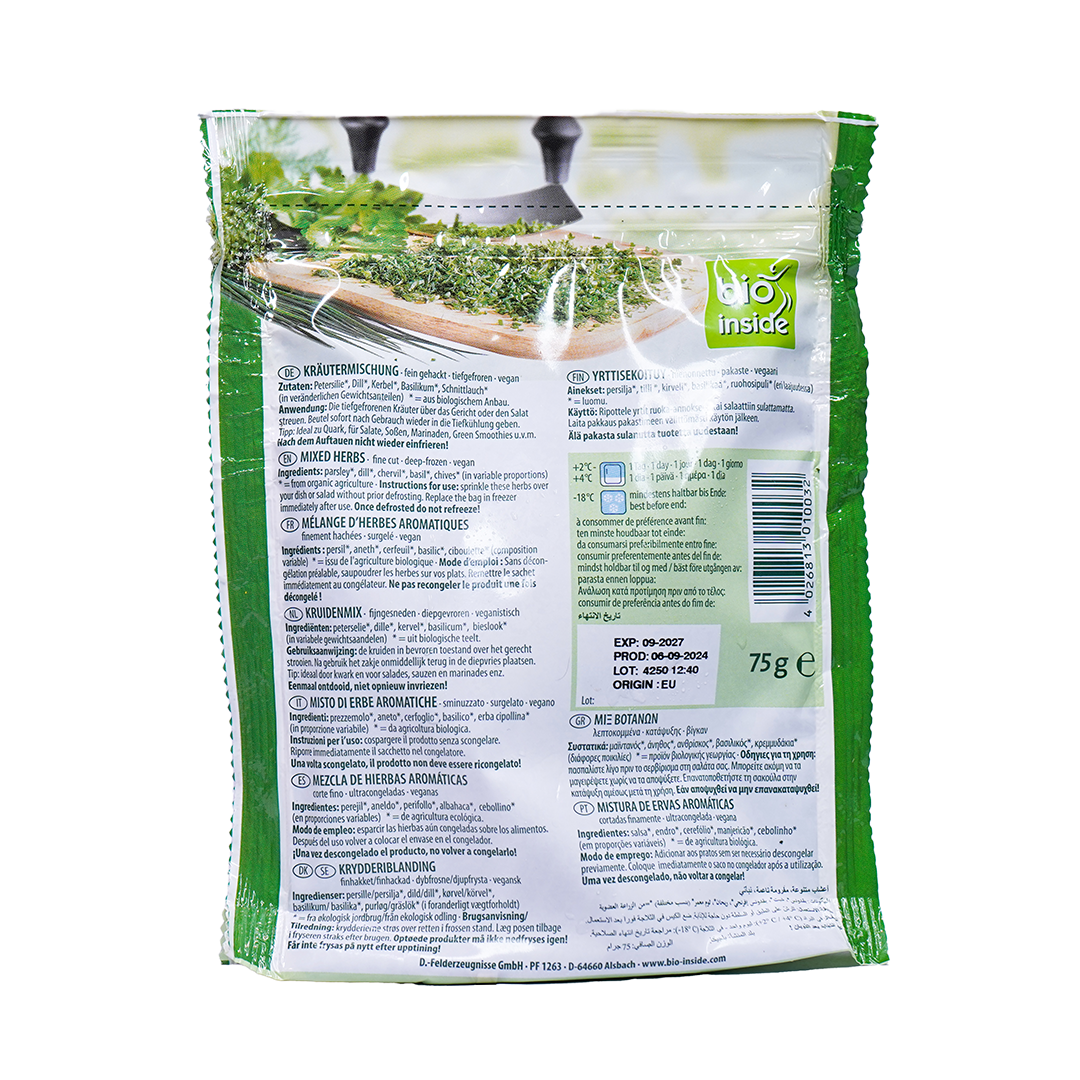 BIOINSIDE Organic Frozen Mixed Herbs (75 g) is a fine selection of chopped, ready-to-use organic herbs, flash-frozen to preserve freshness. Designed for effortless cooking, it brings garden-fresh flavor to your dishes without preservatives.