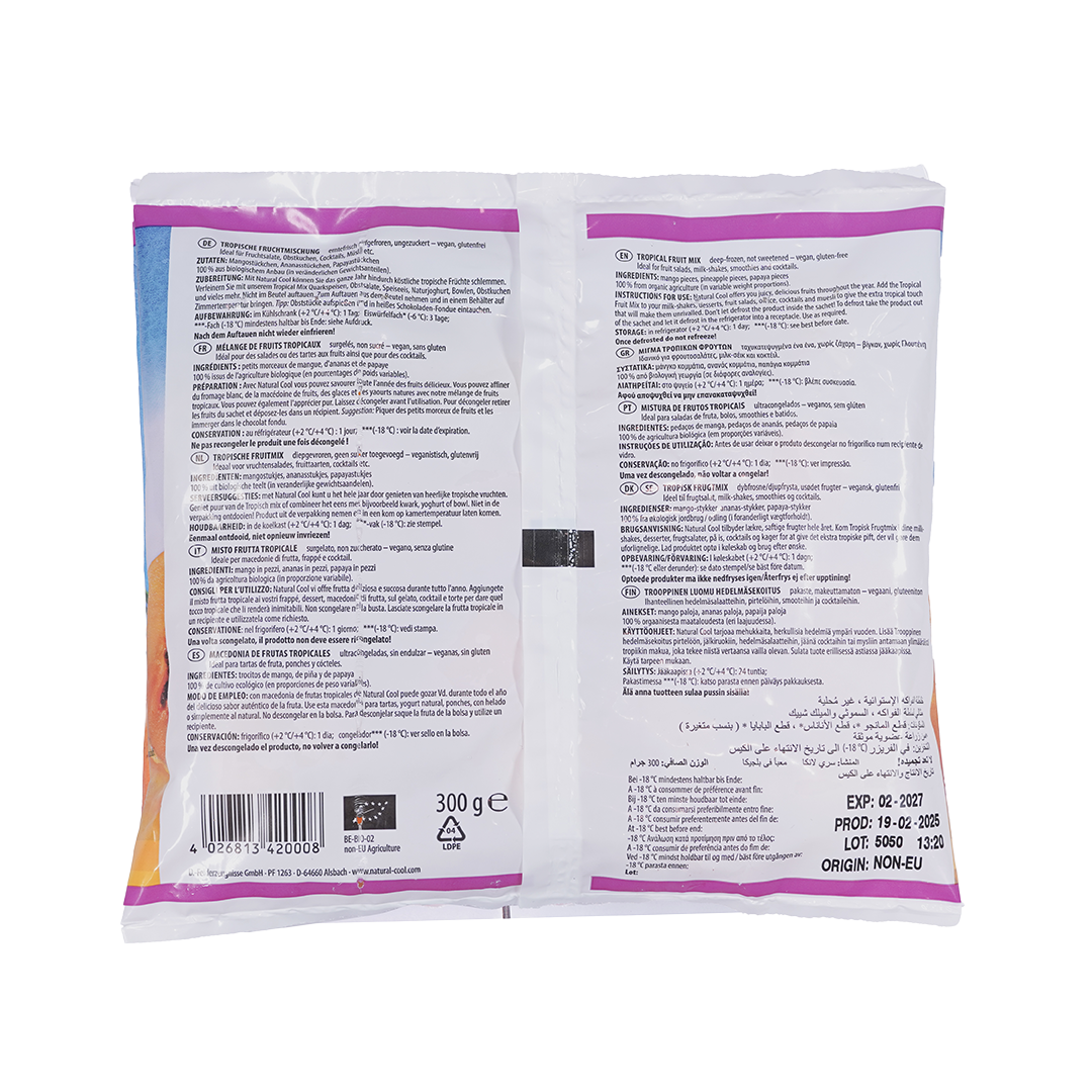Natural Cool Organic Frozen Tropical Mix combines organic mango, pineapple, and papaya chunks frozen at peak ripeness for maximum flavor and nutritional preservation. Each 300 g bag is certified organic and vegan, free from additives, gluten, dairy, and preservatives. Ideal for smoothies, fruit salads, desserts, or snacks. Store at –15 °C to –29 °C (or –18 °C recommended), and enjoy anytime—with vibrant tropical taste, ethical sourcing, and convenience in every bite.