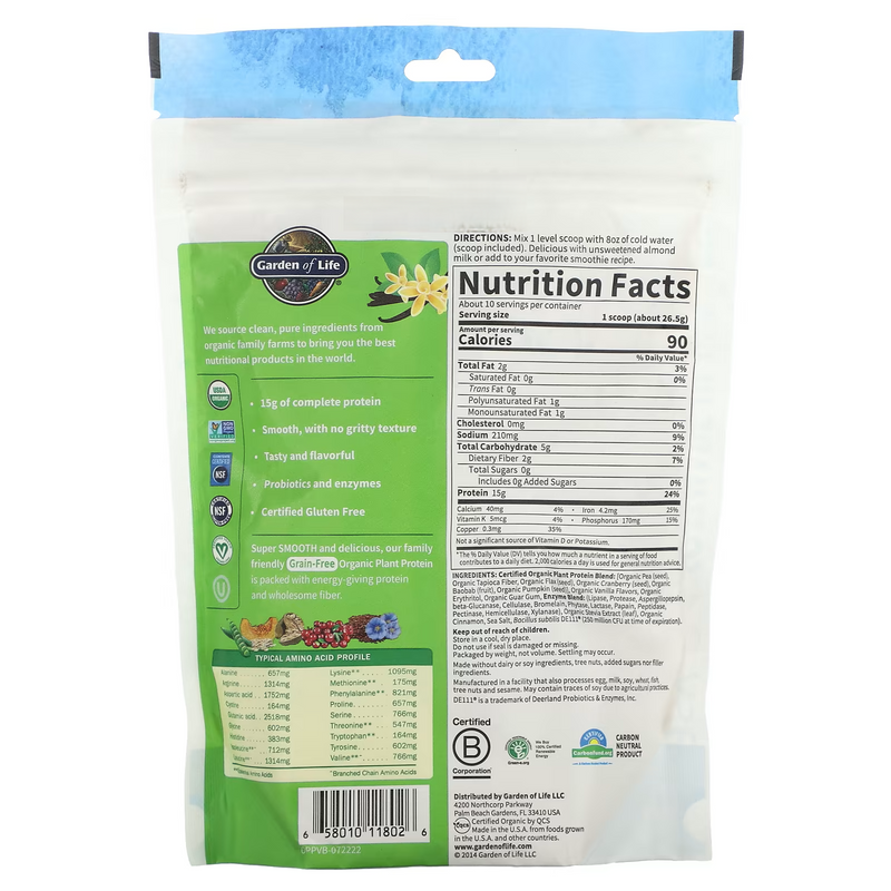 Treat yourself to Garden of Life's plant-based vanilla protein powder. With a smooth vanilla flavor, it provides essential amino acids for muscle health and overall well-being. Vegan and gluten-free.