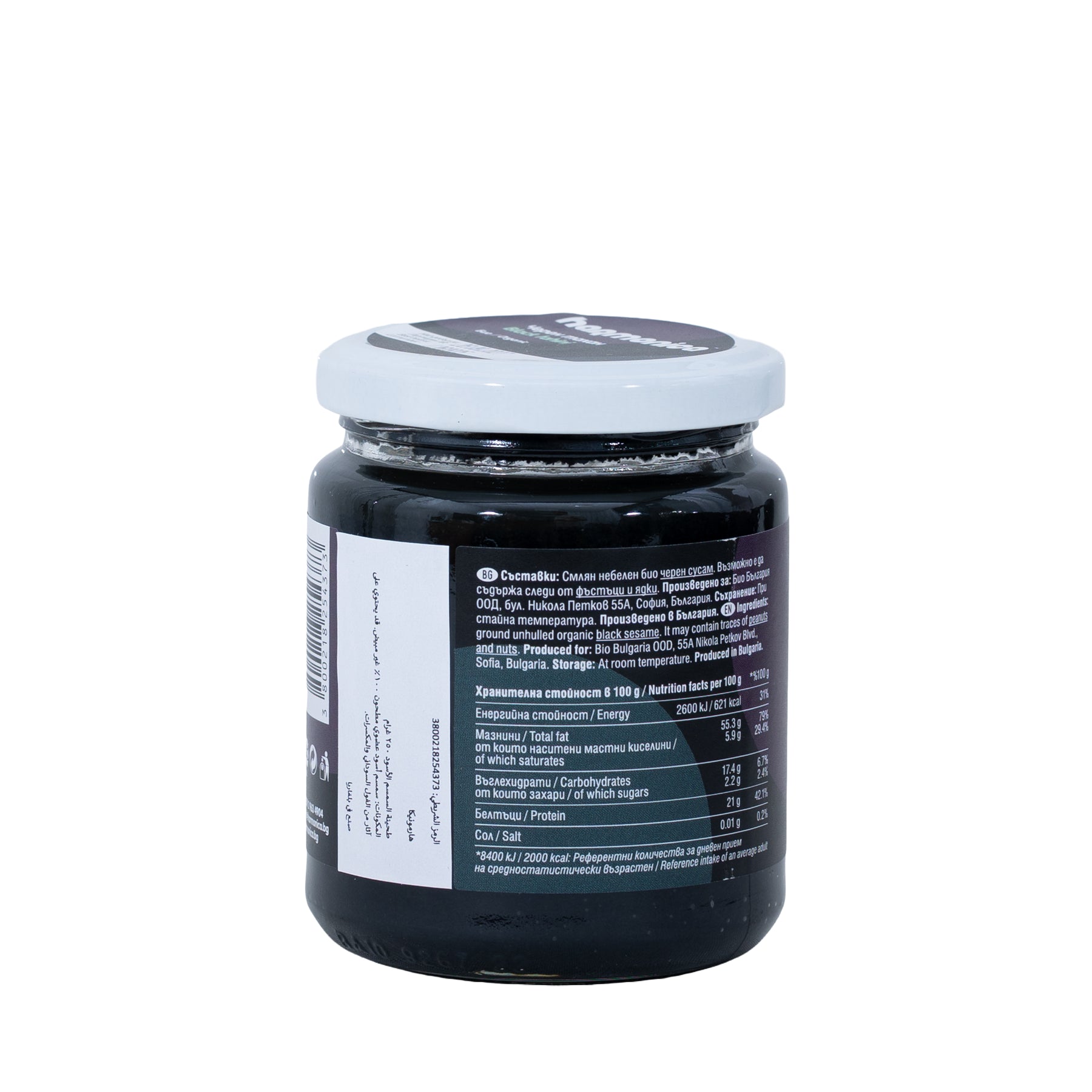 Made from 100 % organic unhulled black sesame seeds—simply heated and stone-ground into a fine paste. No additives or preservatives.