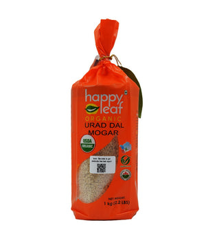 Happy Leaf Organic Urad Dal Mogar 1 kg is a premium, unpolished, pesticide-free lentil ideal for dosas, idlis, and dals. It ensures consistent quality, authentic taste, and natural goodness, backed by a QR-scanned purity test report.