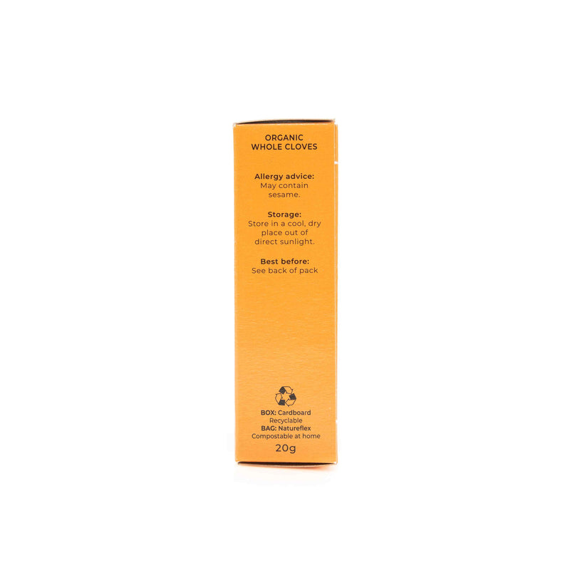 Suma Organic Cloves (20 g) are whole dried flower buds of Syzygium aromaticum, certified organic and vegan, ideal for adding warm, spicy aroma and flavor to both sweet and savory dishes. Used commonly in curries, baked goods, mulled wine, and more.