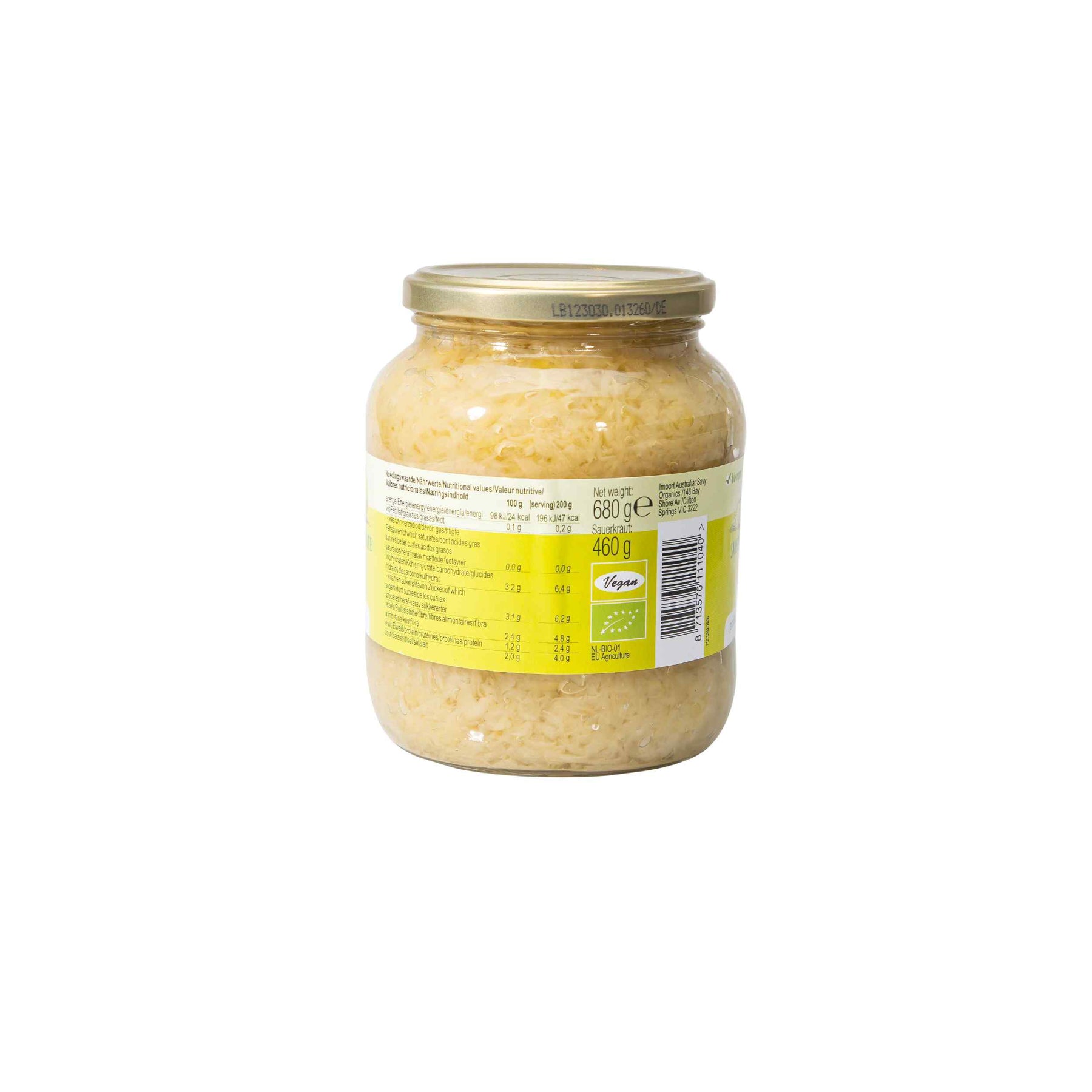 Terrasana Organic Sauerkraut offers a traditional, crunchy texture with a tangy flavor, enhanced by juniper berries. Made from organic ingredients and naturally fermented, it's a versatile addition to meals, promoting digestive health and aligning with clean, plant-based eating principles.