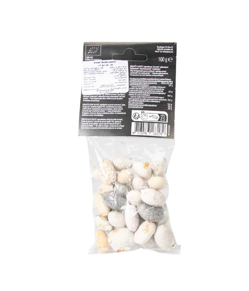Organic, vegan, gluten-free stones providing a minty-sweet treat without animal products or added salt. They contain a good amount of fibre (12.8 g per 100 g) and use natural licorice, elderberry, anise and mint extracts—making them a flavorful, plant-based snack option.