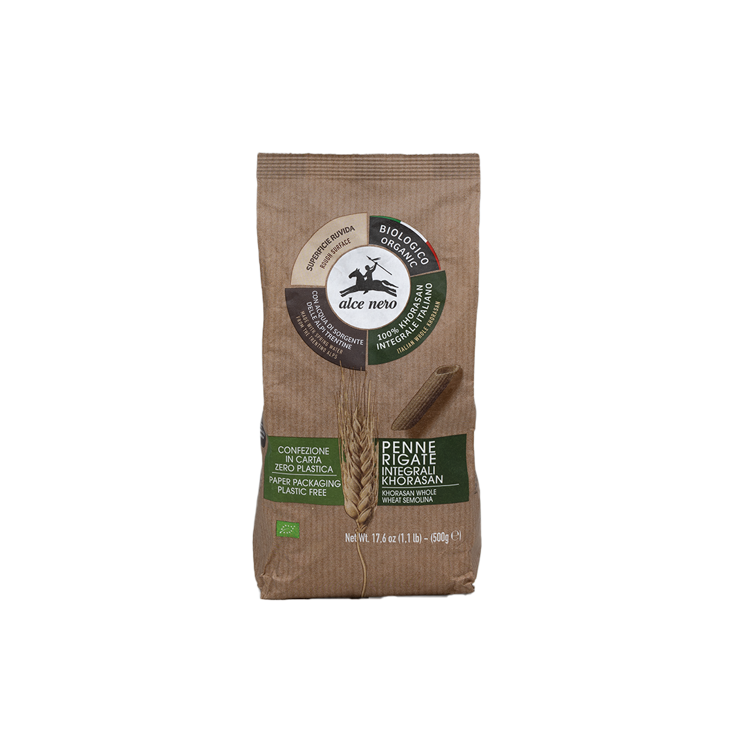 Made exclusively with organic Khorasan wheat grown and milled in Italy, this whole‑grain penne rigate is crafted via a slow drying process to ensure a firm texture and excellent sauce adhesion. Ideal for hearty, nutritious meals with a rustic flavour and high fibre content.